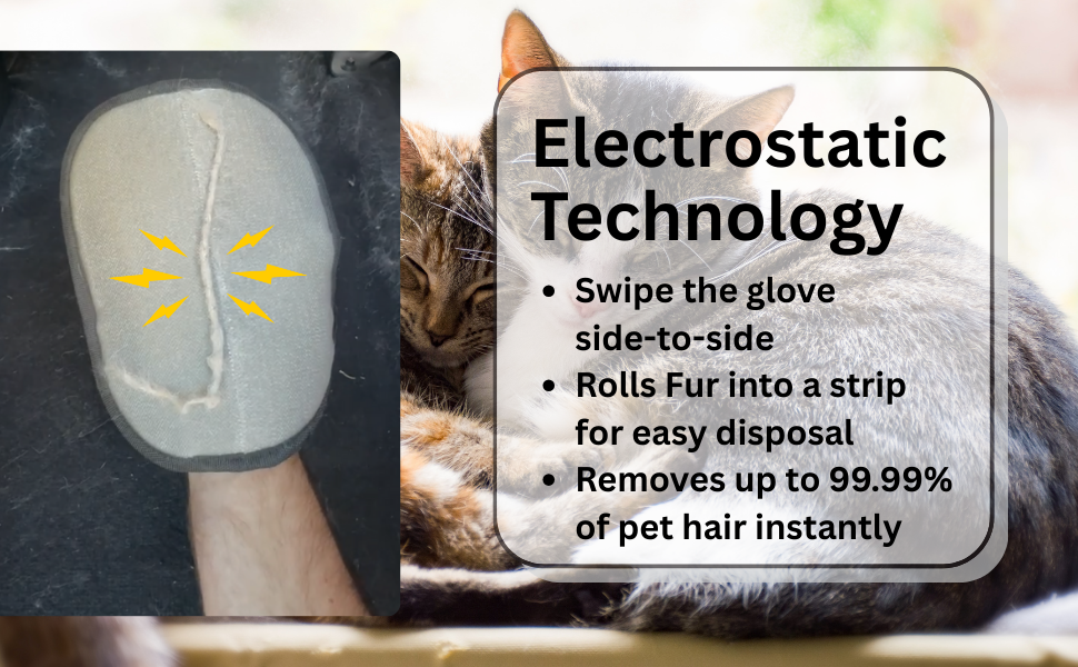 The glove uses electrostatic charge to attract and lift pet hair from surfaces. Simply swipe it over the area, and fur clings to the glove instantly—no sticky tape or refills required.